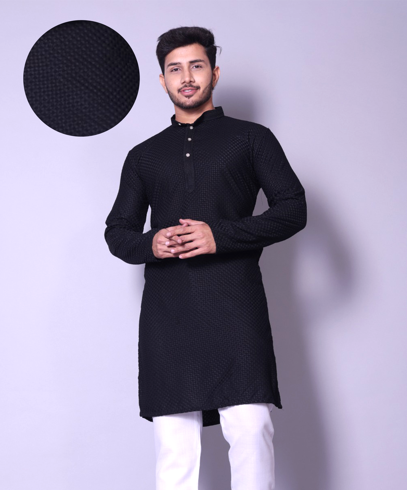 Timeless style meets modern elegance with this classic black kurta, perfect for any occasion. Crafted from a subtly textured fabric, this kurta exudes sophistication while maintaining a comfortable and breathable fit. The minimal design is complemented by a sleek mandarin collar and a clean three-button placket, making it a versatile addition to your ethnic or semi-formal wardrobe. Whether you're dressing for a festive event or a casual celebration, this kurta pairs perfectly with white or beige trousers for a striking contrast.